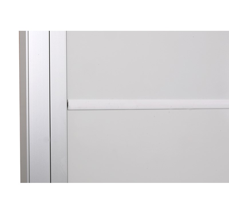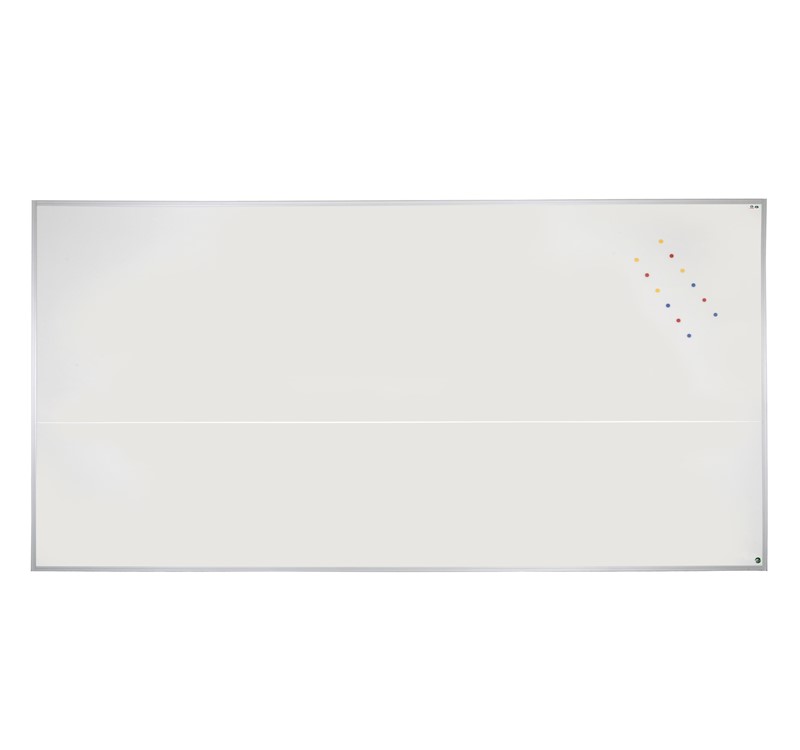 For example, a 210x400 cm board is delivered in 2 panels: 1 top panel measuring H120xW400 cm and 1 bottom panel measuring H90xW400 cm. A white connection profile is present between the panels.