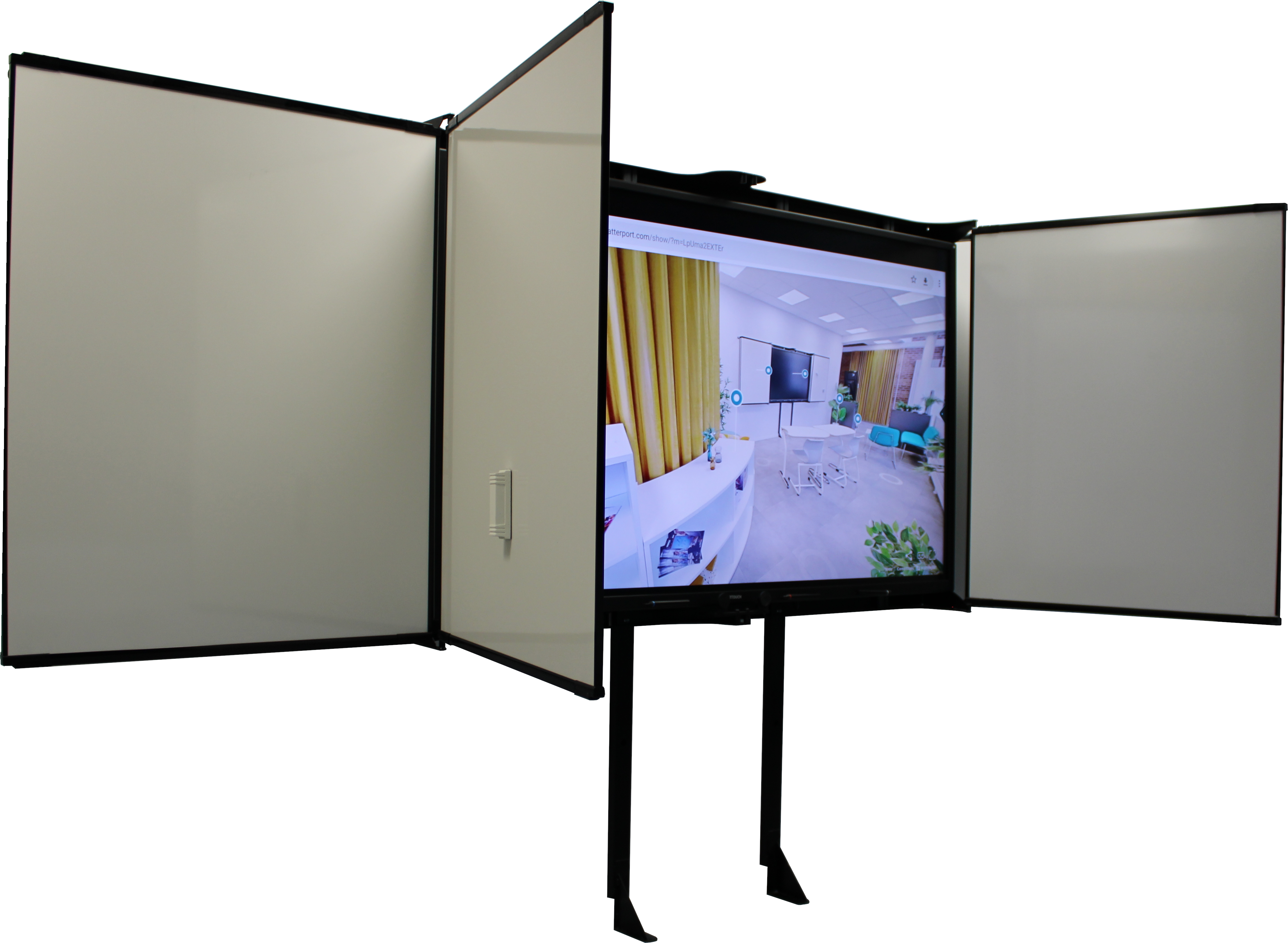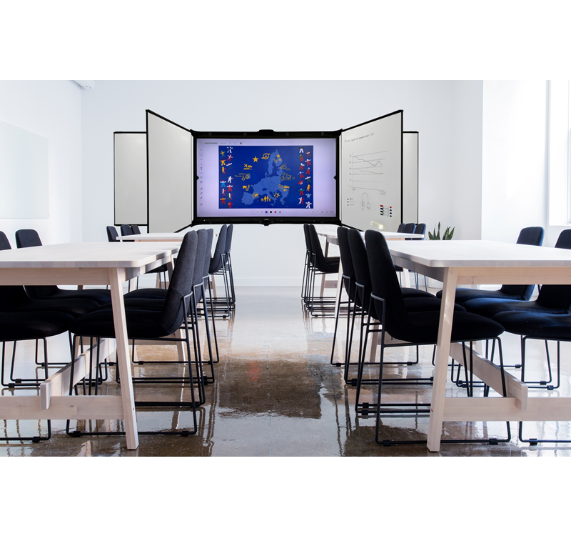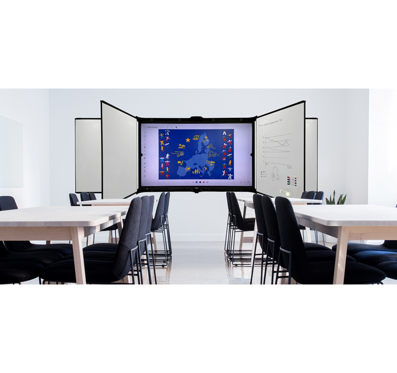 Indeed, this two-wings set with mounting support allows you to combine an interactive touch screen, to use digital resources, with e3 enamel surfaces to write with a dry erase marker and display using magnets.