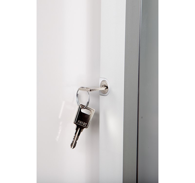 Swing door made from tempered safety glass (4 mm) or polyacrylate (3 mm). Locking by a lock located on the side, delivered with 2 keys.