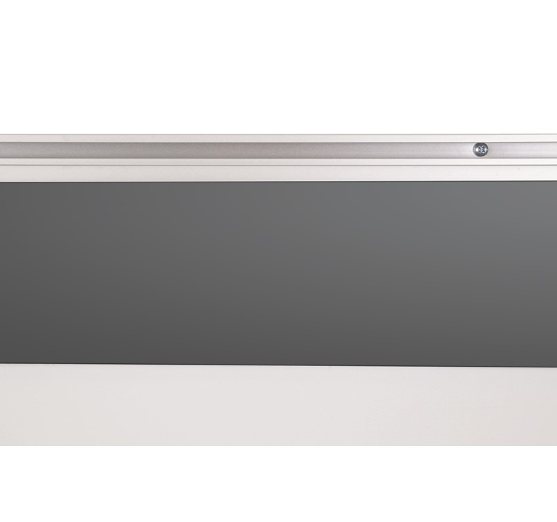 Discreet 7 mm junction profile in white lacquered aluminium. Frame in smooth anodized aluminium (5 µm) to avoid parasites due to the brilliance of the standard aluminium profiles. Aluminium pen tray.